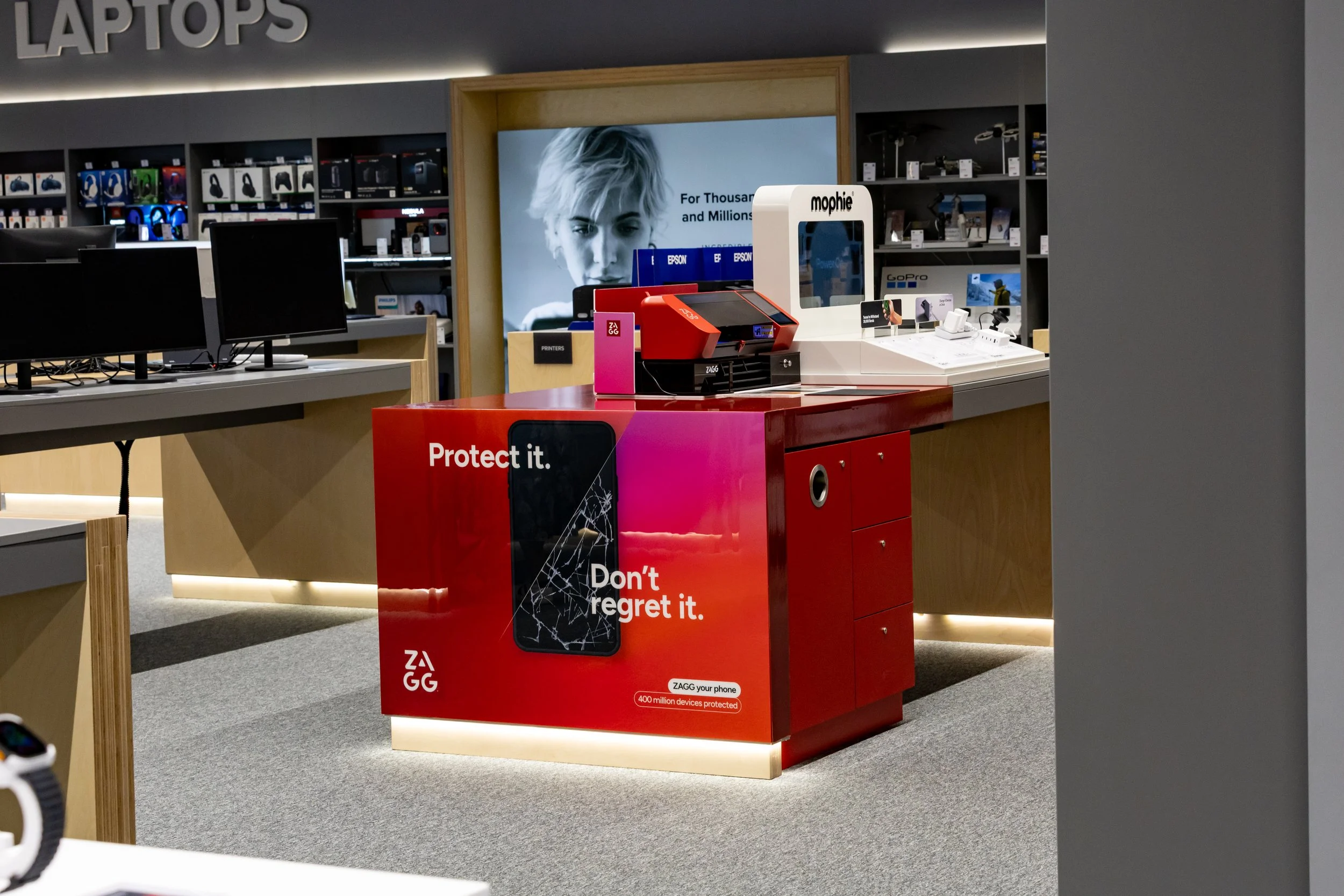We had the opportunity to showcase our brands, ZAGG and mophie, across 4 metres of retail wall space and 2 metres of counter space. Working closely with our retail builder, we created the prefect layout including planogram header banners, counter graphics, in slatwall product display and videos across the space.